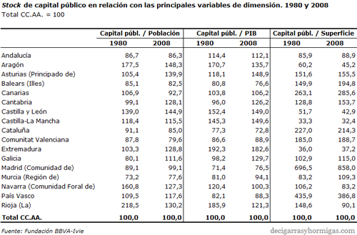 El peso relativo de cada territorio en el stock de capital público depende, en gran medida, de su tamaño, que puede ser definido mediante distintas variables de referencia, como la población, el PIB o la superficie. No existe un único indicador para comparar las dotaciones relativas de capital público, lo que facilita la controversia a la hora de contrastar los niveles actuales de cada territorio, pero no impide corroborar las grandes diferencias regionales existentes en cualquiera de las variables consideradas. En 2008, la comunidad mejor dotada duplicaba a la peor, tanto en términos per cápita (Aragón vs. Región de Murcia) como en relación con la producción (Extremadura vs. Cataluña). Las discrepancias actuales son menores que las existentes en 1980, pero siguen siendo difíciles de justificar. Y las diferencias aún son mayores cuando se considera la superficie.