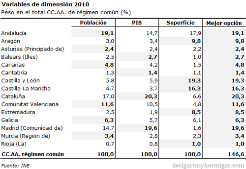 ¿Cuántas Españas serían necesarias para cumplir los diferentes estatutos de autonomía? Veámoslo con el ejemplo contenido en el siguiente cuadro, elaborado con datos de las comunidades de régimen común y donde solo se han considerado las tres variables de referencia habituales (PIB, población y superficie). Se observa que si cada comunidad incorporase la petición en función de la variable que más le conviene (datos sombreados), la suma se elevaría a 146,6%. Por tanto, sería imposible cumplir la generalización de este tipo de cláusulas.