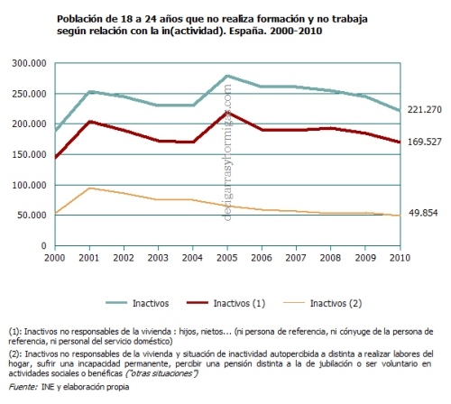 ¿Bastaría entonces con limitarse al colectivo de inactivos que no estudian para obtener una definición más próxima al concepto de jóvenes desilusionados y sin iniciativa? Entre los inactivos se podría centrar la atención en los jóvenes que no son responsables de la vivienda o no forman parte del servicio doméstico, es decir, los que viven de sus padres o familiares más directos (un ejercicio similar fue realizado para 2009 en el blog de WonkaPistas).