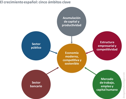 Cinco son los ámbitos clave para el crecimiento sostenido de la economía española y cinco son también los objetivos estructurales urgentes identificados en el Informe: impulsar el cambio de especialización productiva, reforzar la competitividad de la empresa, reformar la educación y el mercado de trabajo, recuperar el normal funcionamiento del sector bancario y redefinir las principales políticas públicas. ¿Los motores de esos cambios? Han de ser las empresas, el sector público y el sector bancario, impulsando para ello reformas en sus ámbitos de actuación.