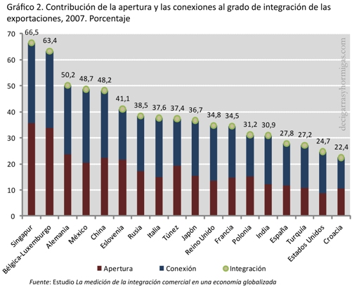 El trabajo también pone el acento sobre la contribución a la integración de las conexiones indirectas que se producen a través de las reexportaciones, un efecto que no parece despreciable, sobre todo cuando se advierten los resultados de economías como Singapur o Hong Kong cuyo grado de integración duplica, prácticamente, al promedio mundial (véase el primero de los países representados en el gráfico 2). De hecho, las relaciones que se producen entre países pueden multiplicarse por mucho si se consideran todos aquellos bienes que pasan por varias economías con baja o nula reelaboración hasta llegar a su destino final. Pese a su importancia y al efecto sobre el grado de integración total, es un aspecto que ha sido escasamente abordado en trabajos previos.