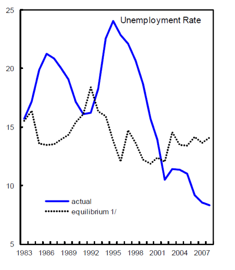 Para empezar, ese trabajo indica que incluso durante el reciente boom (y aquellos grandes descensos del desempleo cada día más lejanos) la tasa de paro natural de equilibrio española apenas se redujo, manteniéndose cercana al 15%. Veámoslo en un gráfico de ese documento: