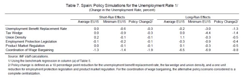 Pero lo más interesante del trabajo es que, además de dar otra vez la conocida receta, estudia empíricamente el caso español comparándolo con el resto de la UE. Eso le permite ofrecer estimaciones de los efectos de diferentes reformas estructurales en tres escenarios: average EU15 (España hace en ese ámbito lo mismo que la media de la UE15), minimum EU15 (si España hiciera lo que hace el país con mejor diseño en ese ámbito de cara al desempleo) y Policy Change (España adopta la combinación de medidas señaladas en la nota 2 del cuadro). Para no alargarnos demasiado, centrémonos en los resultados relativos a los efectos en términos de reducciones de la tasa de paro: