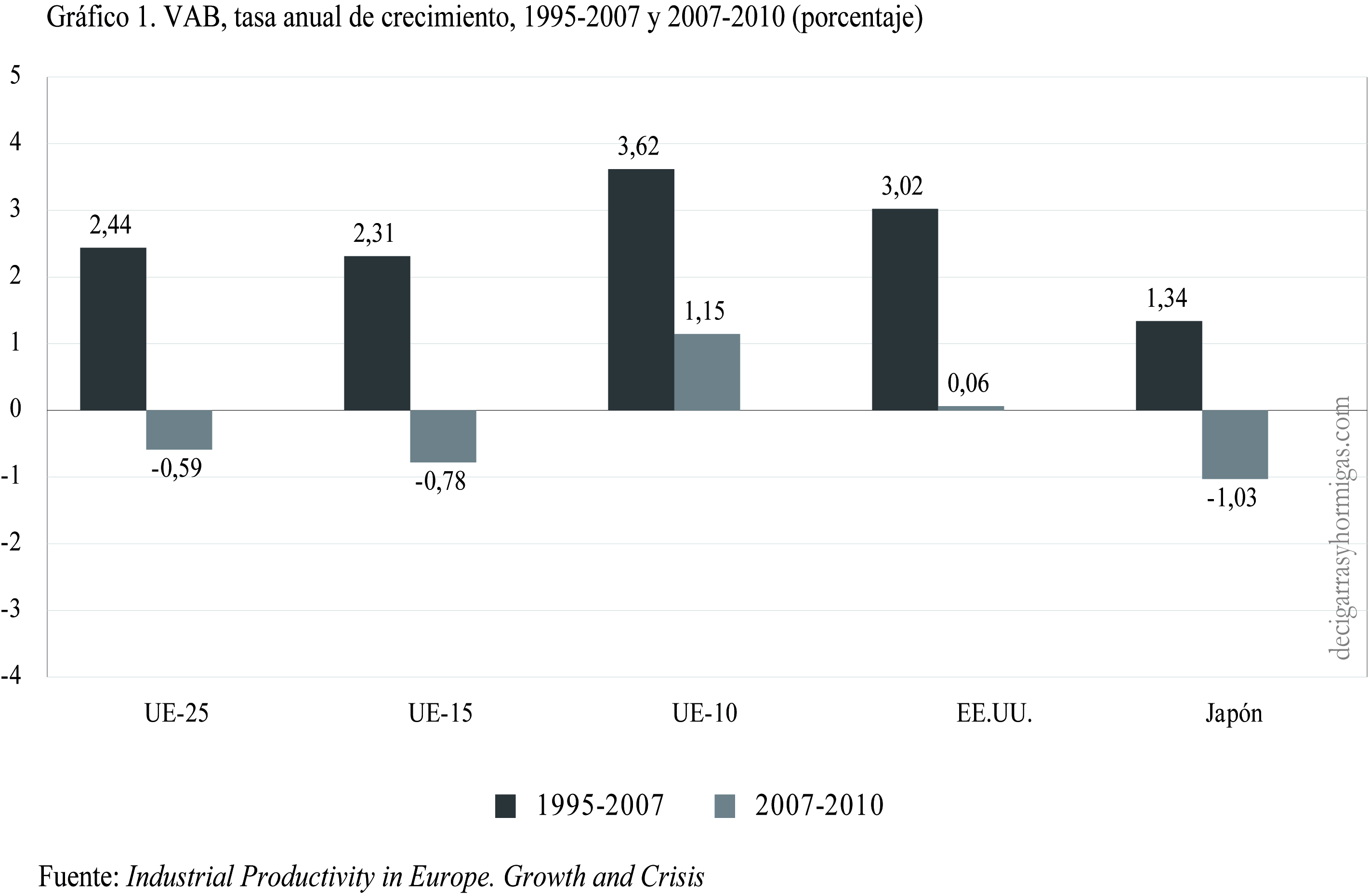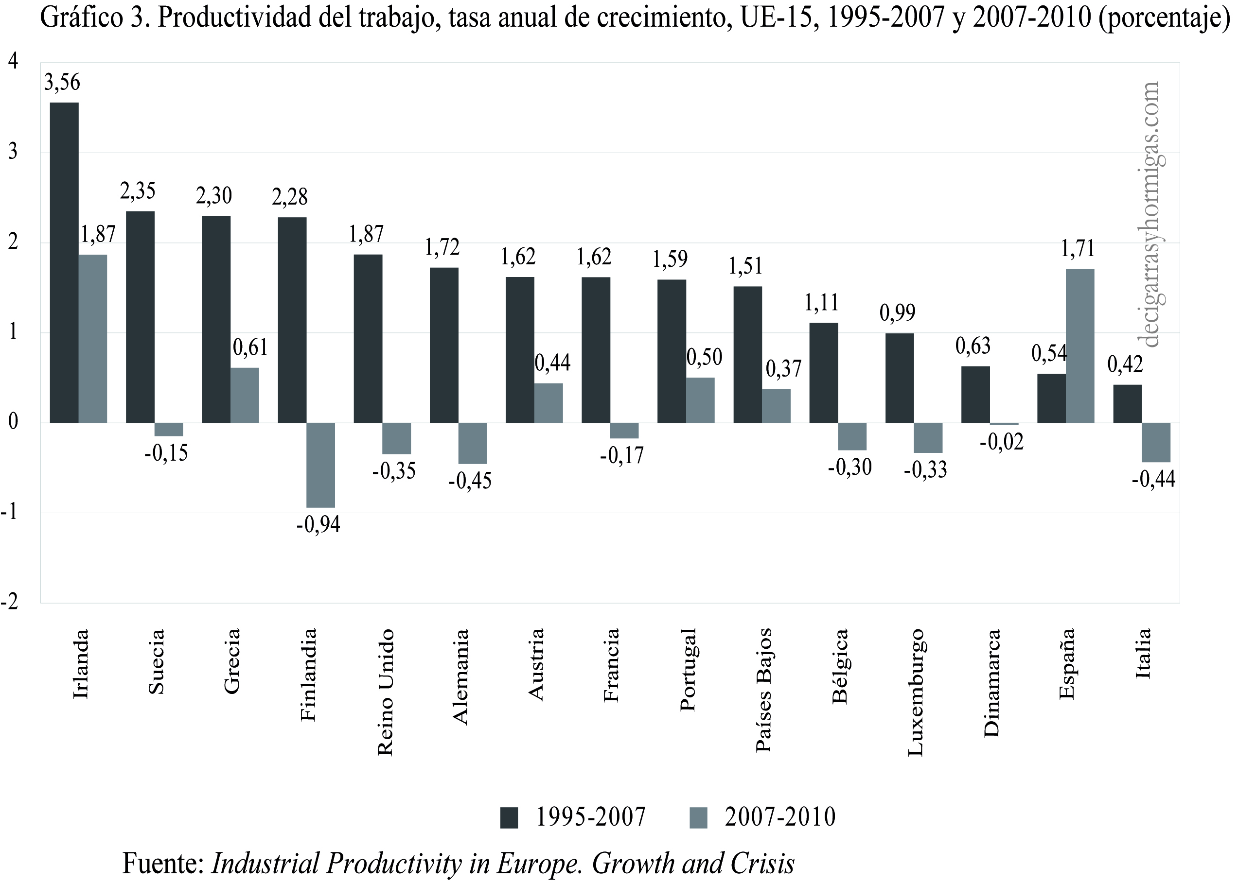 Y en estas llegó la crisis… y volvimos a ser excesivos. El VAB se desplomó casi con la misma intensidad con la que aumentó en los años de expansión. La caída del empleo batió todos los records y, como resultado de este intenso ajuste, la productividad del trabajo se recuperó. De hecho fuimos el único país que experimentó aceleraciones del crecimiento de la productividad en los años 2007-2010. Pero esto no son buenas noticias. Son el resultado del funcionamiento de un mercado de trabajo que destruye empleo a un ritmo similar al que lo crea.