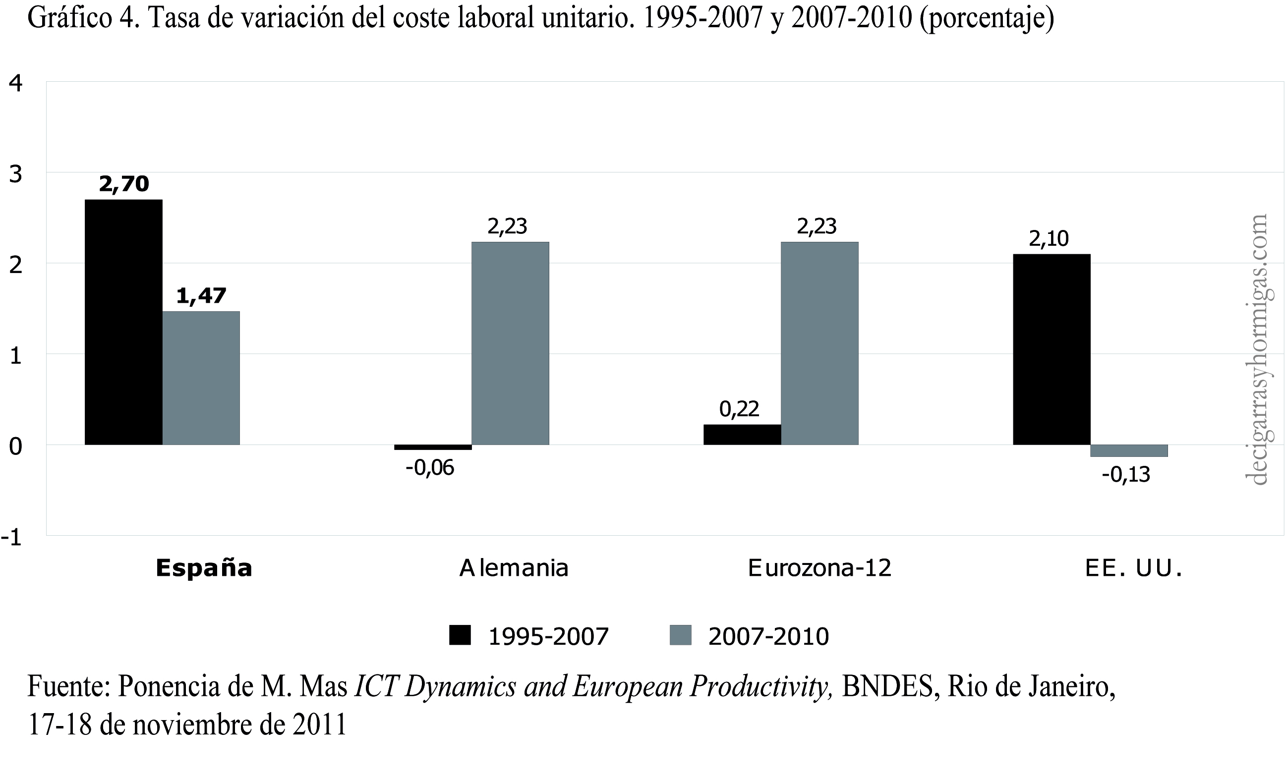 Eran nuestros días de vino y rosas… o así lo parecían. Sin embargo, lo que se estaba cociendo era otra cosa. El crecimiento espectacular del VAB y el empleo nos deslumbró tanto que no nos permitió advertir el lentísimo avance de la productividad. De hecho, dos de los países que están experimentando en la actualidad problemas más graves, España e Italia, fueron los que ocuparon los dos últimos lugares del ranking (gráfico 3). Pese al lento avance de la productividad los salarios continuaron creciendo lo que repercutió negativamente en nuestros costes laborales unitarios y, por lo tanto, en la competitividad de la economía (gráfico 4). Mientras en Alemania los costes laborales unitarios se reducían ligeramente (-0,06%), y en la Eurozona avanzaban lentamente (0,2%), en España se disparaban hasta casi el 3% (2,7%) anual.