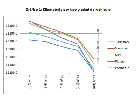 Como puede verse, el kilometraje disminuye conforme aumenta la edad del vehículo. Otro aspecto que me llama la atención, y esto es una intuición personal, es que las familias americanas conducen más que las españolas: dependen más del coche casi para cualquier cosa, la estructura de sus ciudades es distinta, quizá hay menos oferta de transporte alternativo y además la gasolina es más barata. Por ejemplo, una vanette de no más de dos años es conducida, en promedio, algo más de 25.000 km anuales, lo que implica unos 2.100 km mensuales. Esta es una cifra que se me antoja elevada, en comparación con lo que veo para España. El kilometraje de un vehículo turismo está en unos 20.500 km anuales. El propio resumen de la misma ofrece cifras similares en magnitud.