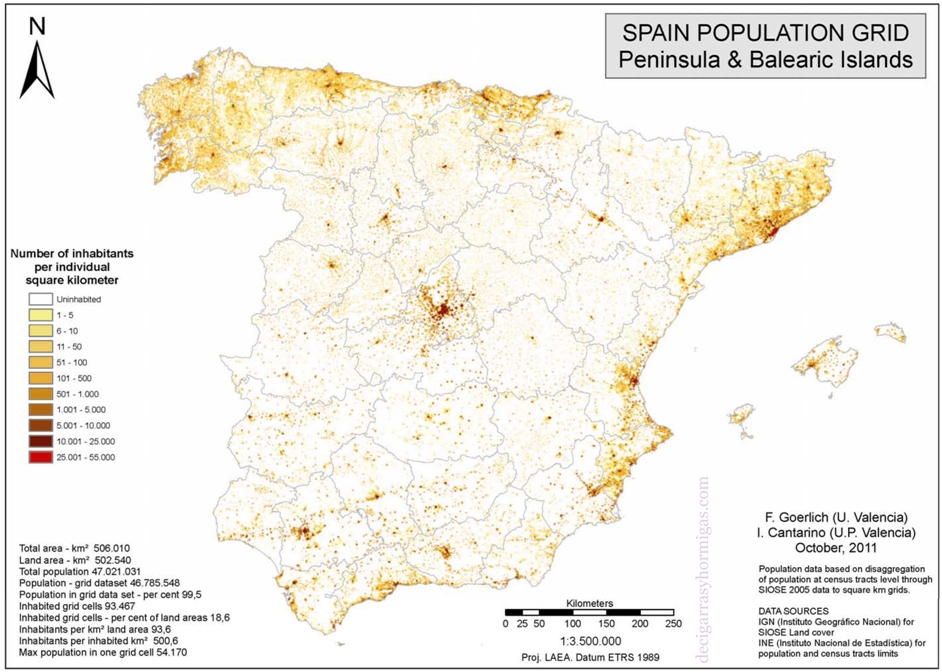 Este mapa es uno de los resultados que presentan hoy Francisco J. Goerlich e Isidro Cantarino en la European Forum for Geostatistics Conference. Nos dice cosas que ya sabemos. Nos cuenta, por ejemplo, que los españoles vivimos sobre todo en el litoral, el valle, la ciudad y las capitales de provincia. Pero la particularidad de este mapa es que (más…)